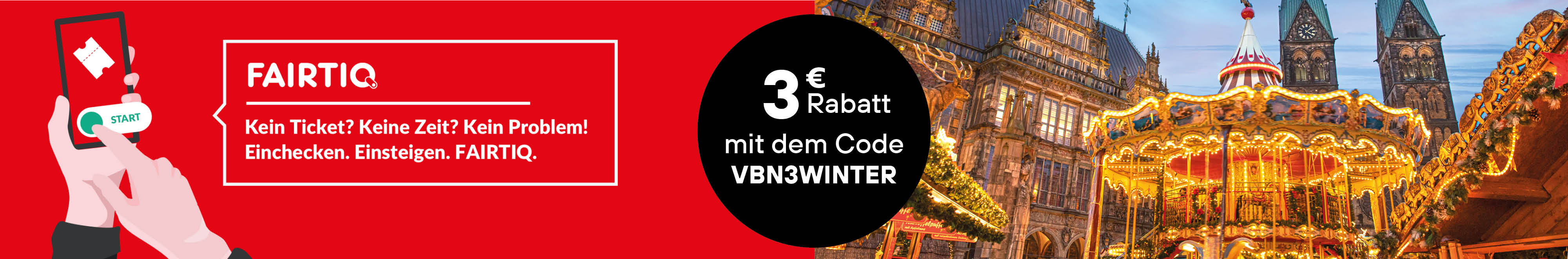 Wer im Aktionszeitraum vom 24. November 2025 bis 1. Januar 2026 mit FAIRTIQ im VBN-Gebiet unterwegs ist, kann sich ganz einfach 3 Euro Guthaben sichern: